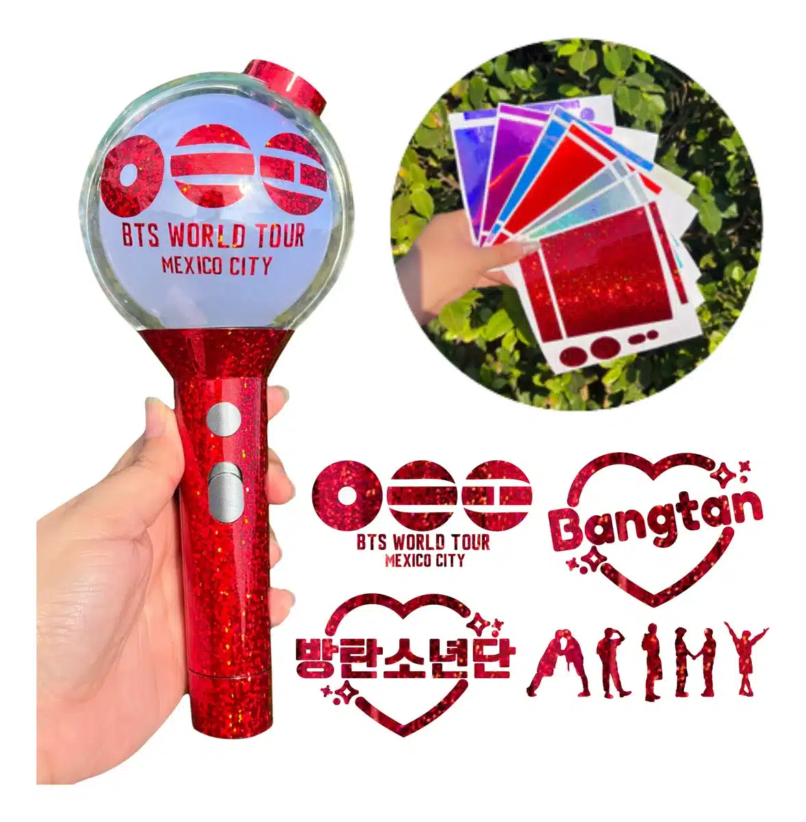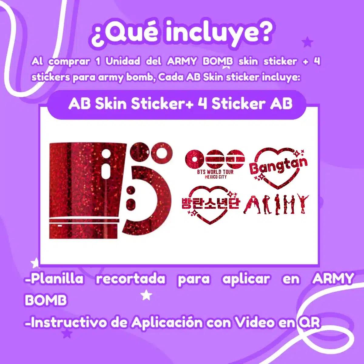 Este vinil sticker de alta calidad es resistente y con un acabado especial está diseñado para darle a tu Army Bomb un nuevo look lleno de estilo. Resalta los colores y detalles de tu Lightstick, mientras lo proteges con un diseño único y vibrante. ¡Es la manera perfecta de personalizar tu ARMY BOMB y hacerla brillar como nunca!