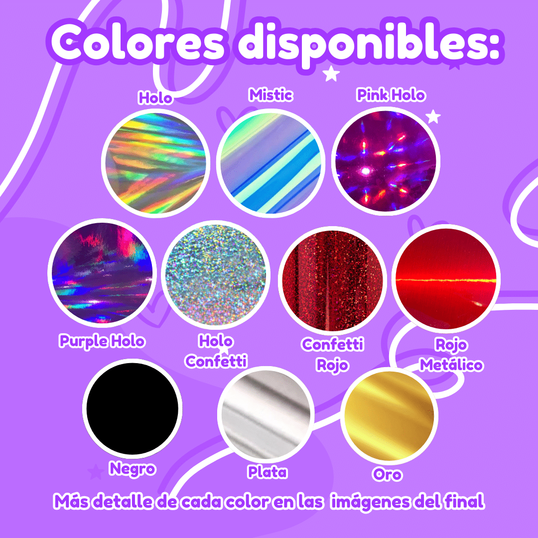 | Color: | Random, Holo, Mistic, Pink holo, Purple holo, Holo Confetti, Confetti Rojo, Rojo Metálico, Negro, Plata, Oro |
